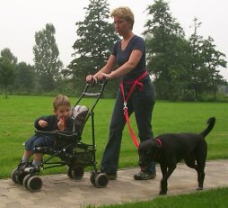 Die Hände bleiben am Kinderwagen und der Hund läuft sicher an der Leine. |