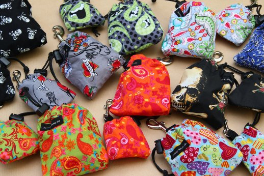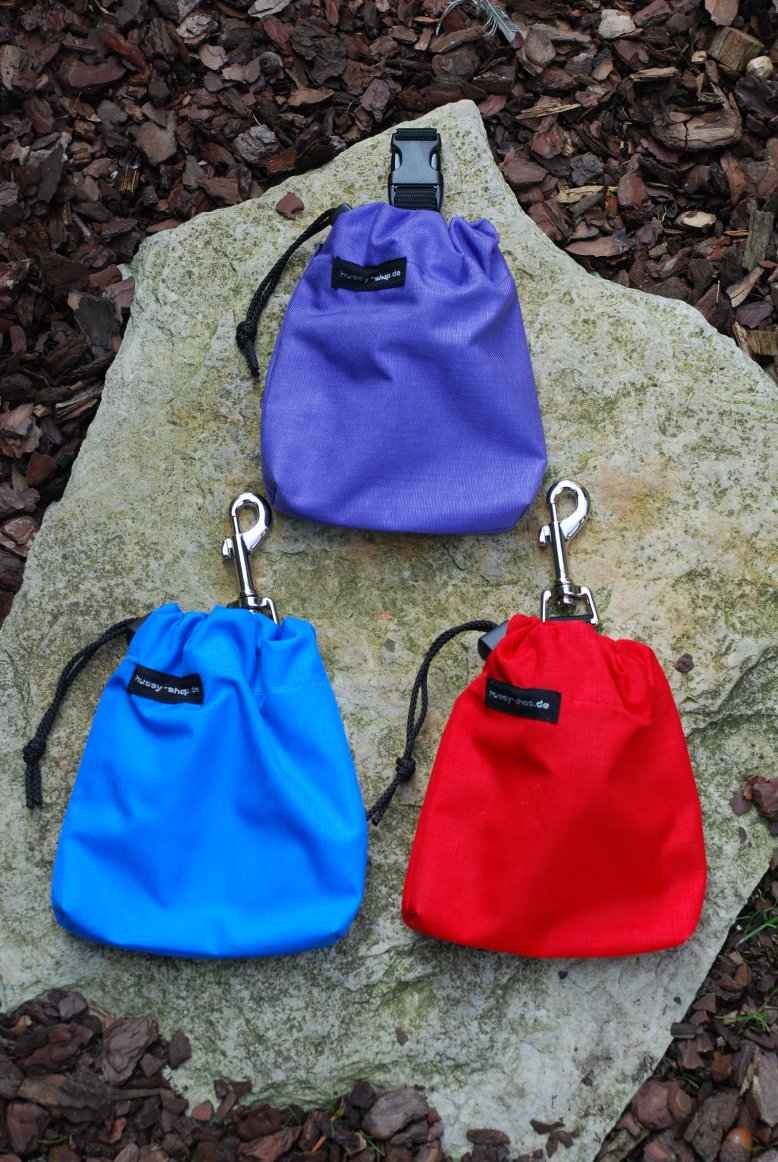 Der Leckerchenbeutle ist zweilagig genäht: Der Oberstoff ist wasserdicht. Der Beutel ist waschbar. (Bitte drehen Sie ihn zum Waschen auf links, das freut Ihre Waschmaschine!) Die Beutel sind in drei Befestigungsvarianten erhältlich: |